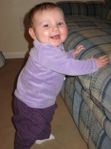 Abbie is now just over seven months old. She’s a happy little girl. She is smiling and laughing all the time. She is scooting around our living room and taking her first crawling steps. As you can see from the picture, she loves to stand up. It wouldn’t surprise us if she started walking a little early.