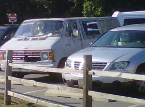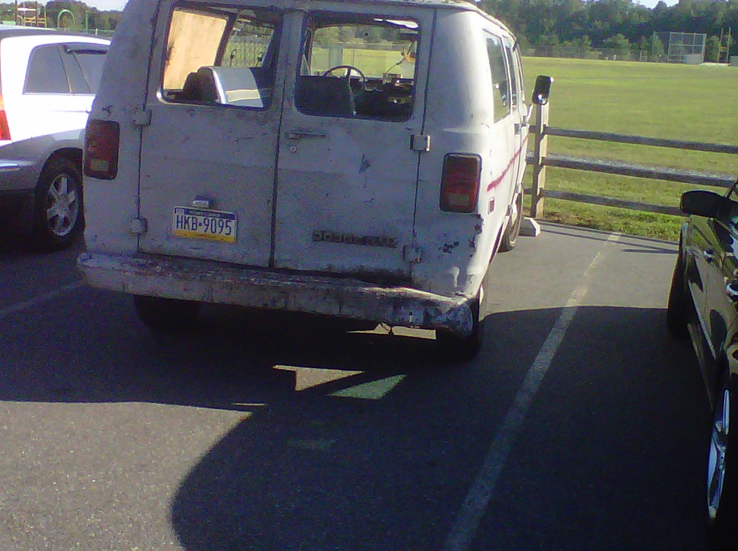 3. Creeper Van?? I saw this van in Delaware. First, you may notice the sheet of plywood in the window. But there was also a chain link fence kind of rigging in the opposite window. Oh yeah, a couch in the back. The cherry on top was that the roof was cut so the van was like a convertable. Epic.
