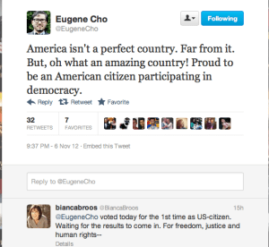 Last night, we re-elected Barack Obama for a second term as President of The United States of America. Some are joyful about this, while others are, well- not happy. One thing to remember, regardless of which end of the political continuum we find ourselves on is this- we are blessed to live in a country where we can freely vote for who our leaders will be. I went to the polls and did not see any security, no guns, no fear of being killed for my opinion or belief on who our Commander-In-Chief should be. Eugene Cho posted this on twitter last night and in the process of an election, I think it is important to remember (especially for us born as citizens and taking our democracy for granted).
