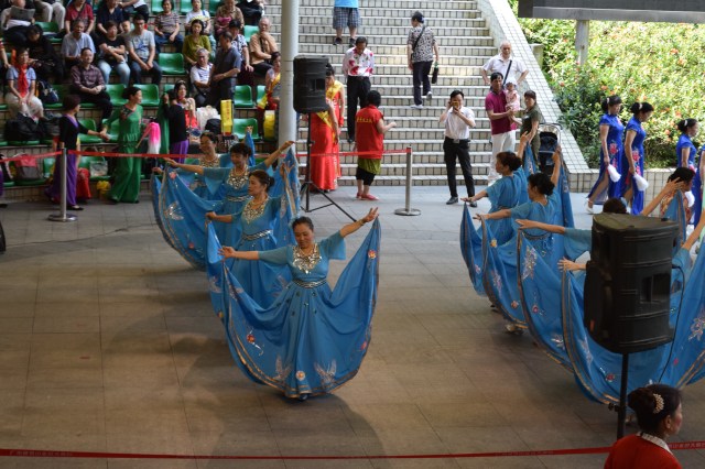 We were able to sit and watch a, for a lack of a better word, talent show that was happening at the amphitheater. There were groups in colorful costumes doing dances and singing songs. (For those in the Caesar Rodney Immersion Program, it feels/looks a lot like the Chinese New Year Celebration at Delaware State University.) The show started at 9:30 and ended at 11:30 a.m. before the real heat set in. There was a schedule set up and there are shows nearly every day in for people to participate in and watch. There were well over 100 people watching the show.